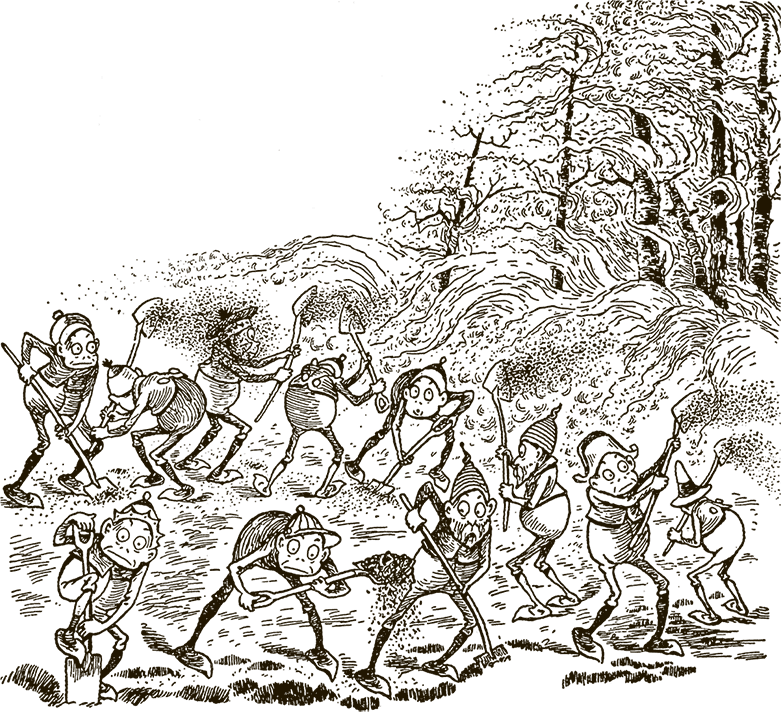 Среди едкого дыма и пылавшего огня лесные человечки трудились не покладая рук до темноты. Мало-помалу огонь стал стихать и, наконец, совсем погас.