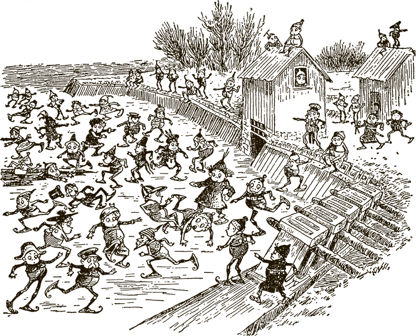 Очень скоро лесные человечки приноровились к лыжам, и, точно в сапожках-скороходах, принялись бегать наперегонки по лесным полянкам.