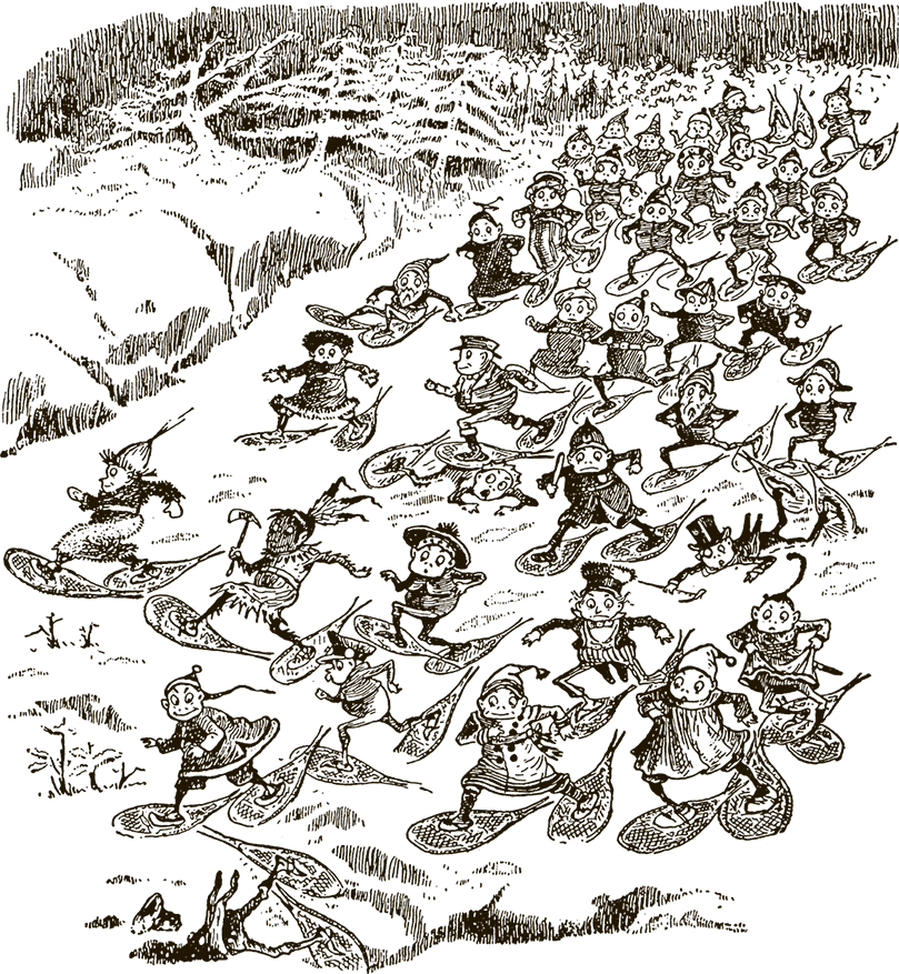 Сначала им было трудновато: многие вязли в сугробе, задевали друг друга, падали. Доктор Тюбик-Мазь чуть было даже не утонул в снегу, а Мурзилка увяз так крепко, что его с трудом вытащили.