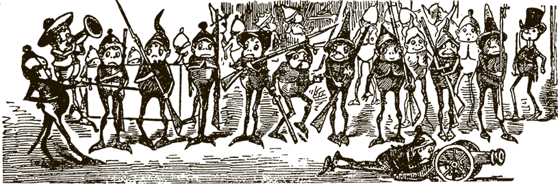 Раздав всем оружие, главнокомандующий Скок приказал Вертушке трубить сбор и стал объяснять новоиспечённым воинам, как следует заряжать ружьё и как стрелять.