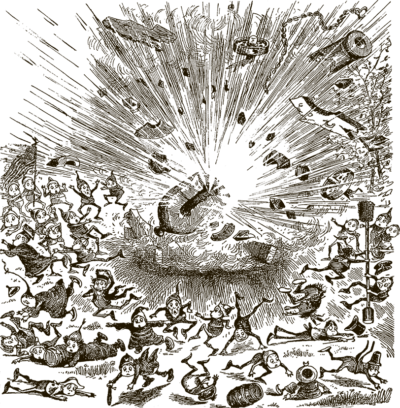 Дальше произошло то, чего никак нельзя было ожидать: осколок гранаты, попавший в самое жерло старой пушки, разорвал её на мелкие части. В воздух полетели какие-то колёса, цепи, куски меди, деревянные и железные брусья, на которых стояла пушка, и всевозможные обломки. Всё это смешалось с песком и пылью. Земля задрожала под ногами, и многих малюток подбросило высоко-высоко в воздух, а потом, в том числе и Мурзилку, шлёпнуло на землю.