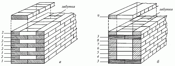 Рис. 9. Система перевязки: а – однорядная; б – многорядная; 1 – тычковый ряд; 2 – ложковый ряд; 3 – тычковый ряд; 4–9 – ложковые ряды