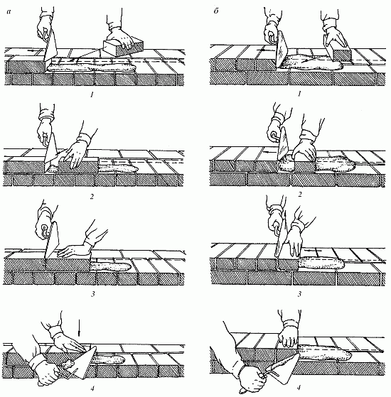 Рис. 10. Кладка вприжим: а – ложкового ряда; б – тычкового ряда; 1–4 – последовательность действий