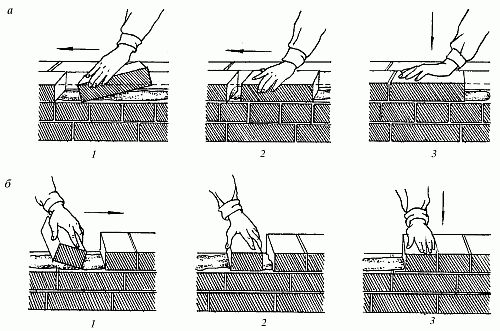 Рис. 11. Кладка наружной версты вприсык: а – ложкового ряда; б – тычкового ряда; 1–3 – последовательность действий