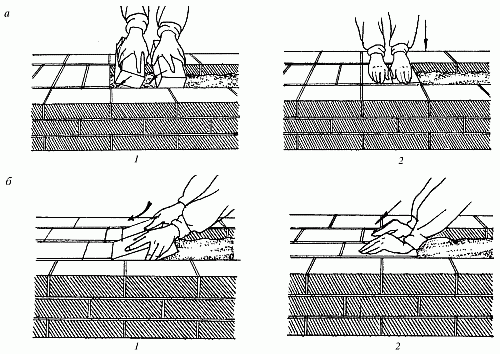 Способом вприсык (рис. 11) ведут кладку на пластичных растворах (осадка конуса 12–13 см) с неполным заполнением швов раствором по лицу стены, т. е. впустошовку. Процесс кладки ложкового ряда при этом способе выполняют в следующем порядке. Взяв кирпич и держа его наклонно, загребают тычковой гранью кирпича часть раствора, предварительно разостланного на постели. Загребать раствор начинают примерно на расстоянии 8–12 см от ранее уложенного кирпича. Придвигая кирпич к ранее уложенному, постепенно выправляют его положение и прижимают к постели. При этом часть раствора, снятая с постели, заполняет вертикальный поперечный шов. Уложив кирпич, осаживают его рукой на растворной постели. При кладке тычкового ряда процесс укладки выполняют в той же последовательности, что и ложкового, только раствор для образования вертикального поперечного шва подгребают не тычковой, а ложковой гранью. Этим способом кирпич можно укладывать как левой, так и правой рукой.