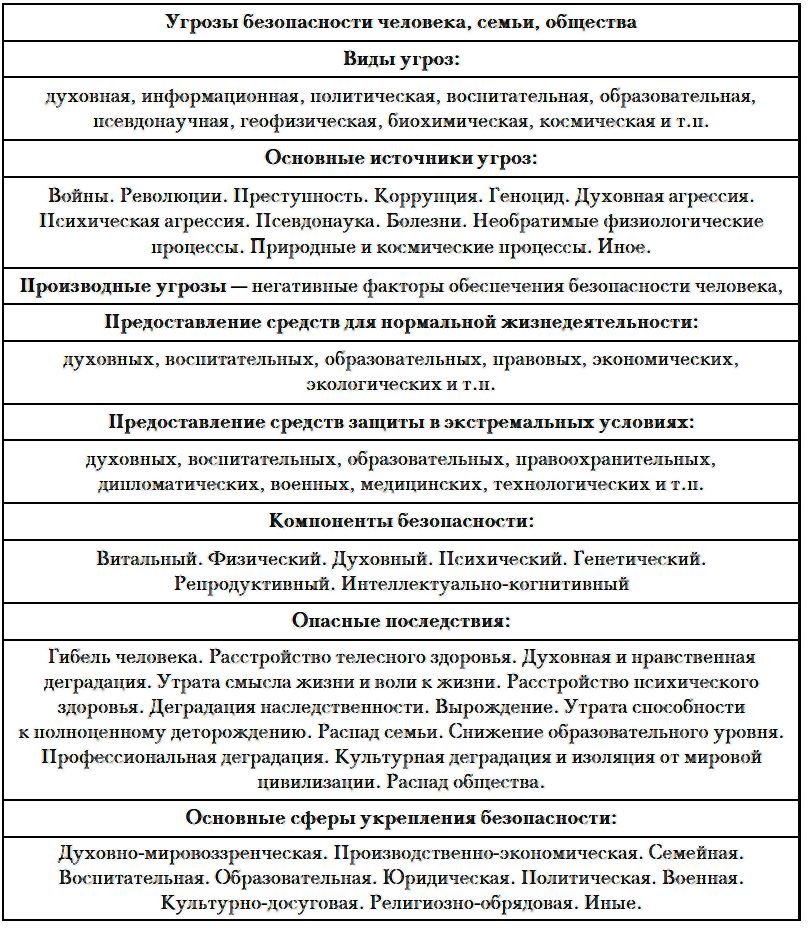Отмеченное в предыдущем абзаце представлено на нижеследующей схеме «Угрозы безопасности человека, семьи, общества».