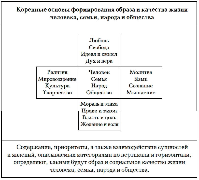 Вера и религия занимают первые места в ряду факторов, формирующих образ и качество жизни каждого человека, народа и общества. Это обстоятельство можно продемонстрировать в виде креста, показанного в нижеследующей таблице. В ней отображена трактовка восходящего взаимодействия коренных факторов, позитивно формирующих образ и качество жизни человека, семьи, народа и общества. В качестве дополнения приводятся также несколько таблиц, поясняющих смысл веры, духовности, религии и некоторых иных понятий, ключевых для проблем духовной безопасности и духовно-нравственного здоровья.