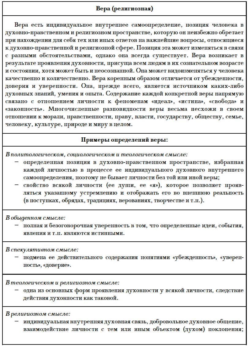 Прежде всего покажем важность такого феномена, как вера и религия. Древнерусское слово «вера» означало «верование», «правда», «присяга», «клятва». В древних языках германской группы оно соответствовало понятиям «честность», «правда», «истина», «союз», «договор», «обет», «дружба». Подлинное значение слова «вера» объединяет эти понятия, устанавливающие некие связи между личностями. Но упор делается на ту личность, которая, собственно, и верует.