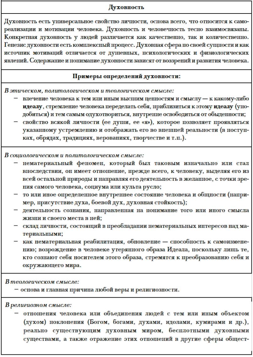 Важно помнить, что качественные характеристики духовности и веры непосредственно взаимосвязаны – в частности, их истинность или ложность. Они могут быть позитивными или негативными, светлыми или темными, истинными или ложными, правдивыми или правдоподобными, зрячими или слепыми, сильными или слабыми, здоровыми или больными. Вера и духовность определяют, куда стратегически будет стремиться человек, какие он предпочтет методы достижения своего идеала, соответственно, законные или противоправные. Духовность и вера осознаются, действуют и канонически выражаются через надлежащие вероучения, вероисповедания, веро-определения.