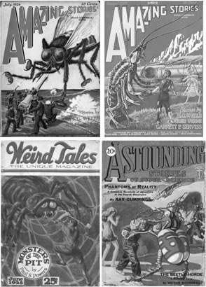 Рис. B.1. Человеческий страх перед членистоногими во многом нашел свое отражение в различных повествованиях: от библейских историй о саранче до жука Кафки и дешевых журналов 1910-х гг. с ужасающими картинками на обложках.