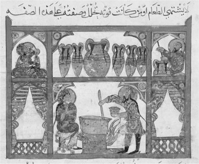 Рис. В.2. Аптекарь, изображенный на рисунке из арабского трактата XIII столетия, смешивает ингредиенты для обычного средства от слабости и потери аппетита по рецепту, включающему мед, пчелиный воск и человеческие слезы. Абдуллах ибн аль-Фадль «Приготовление снадобья на основе меда» (1224).