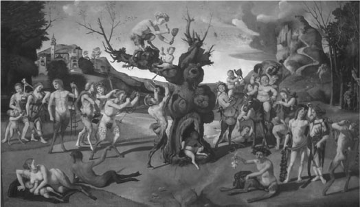 Рис. В.3. Согласно одному греческому (и римскому) мифу, все началось с того, что Дионис (Бахус) пленил первый пчелиный рой, заперев его в дупле дерева. Пьеро ди Козимо «Открытие меда Бахусом» (ок. 1499).