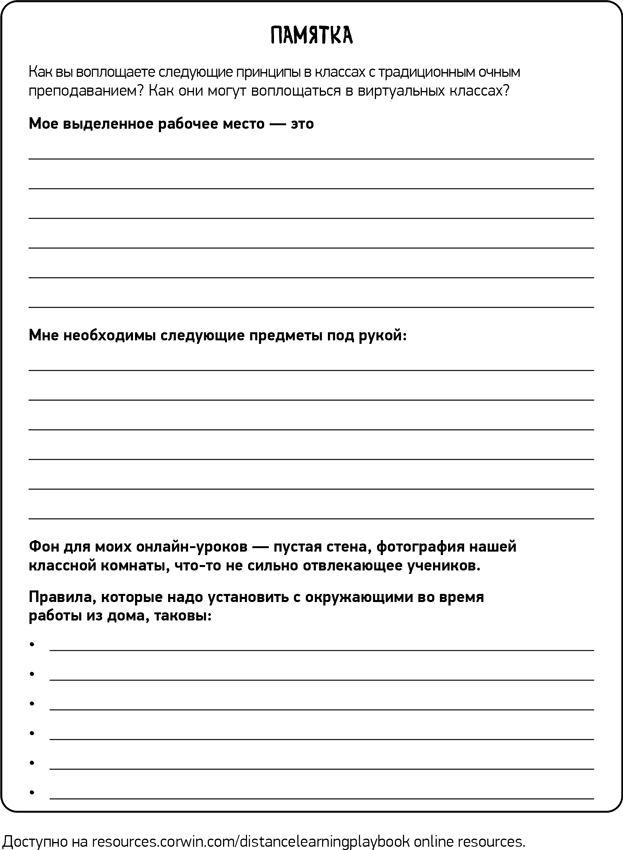 Распорядок дня помогает нам организовывать, планировать и прогнозировать. Один из рисков, связанных с дистанционным обучением, заключается в том, что наш распорядок нарушается и мы не знаем, как его восстановить. В будущих модулях мы сосредоточимся и на распорядке для учеников. А пока нам нужно уделить должное внимание распорядку дня для нас, преподавателей. Приведем один пример. Стефани Карденас занимается ходьбой каждое утро, а затем завтракает со своей семьей. В соответствии с ранее установленным графиком у нее запланированы перерывы в течение дня. Стефани устраивает двадцатиминутный перерыв утром, затем отдыхает сорок пять минут в обед и делает небольшой перерыв на растяжку во второй половине дня. Она заканчивает свой рабочий день, отправляя итоговое электронное письмо ученикам, в котором благодарит их за работу и напоминает о задании на следующий день. У Стефани также есть свои вечерние ритуалы – чтение либо медитация. Она говорит: «Примерно 20 минут каждый вечер я стараюсь провести в одиночестве. Я заядлый читатель, так что меня это успокаивает. Но несколько дней в неделю мне нравится медитировать и просто сидеть тихо, отпуская мысли. После этого я готова ко сну и с нетерпением жду следующего дня».