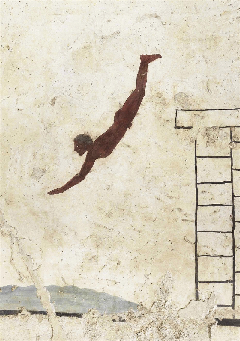 Изображение ныряльщика из гробницы в Пестуме (по-гречески город назывался Посейдония) – одно из тех редких произведений античного искусства, что сразу обращают на себя внимание и навсегда остаются в памяти у самых разных зрителей. Для любителей античного искусства теплые краски этого редкого памятника великой греческой живописи – живительный прорыв за пределы белоснежного мира мраморных статуй; а изящество и грация, с какими передан неожиданный мотив прыжка в воду, неодолимо притягательны сами по себе. Для ученого же это уникальное изображение – невероятный вызов: кажется, что, пока ты не понял эту картину, какая-то существенная часть античной культуры остается тебе недоступна.