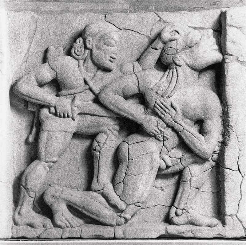 Геракл убивает гиганта Алкионея. Метопа первого архаического храма в устье Селе. Около 550 г. до н. э.