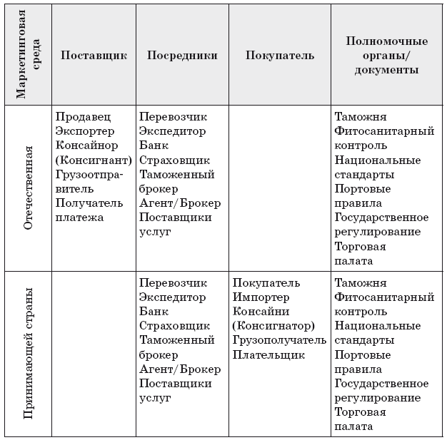 ♦ прочие посредники, которые вовлекаются в исполнение необходимых для внешнеторгового контракта процедур, включая таможенных брокеров и универсальных операторов («единого окна»), а также поставщиков услуг, в роли которых выступают организации, обеспечивающие услуги одной или более сторон в цепи поставок (обычно в форме обработки данных и обмена информацией);