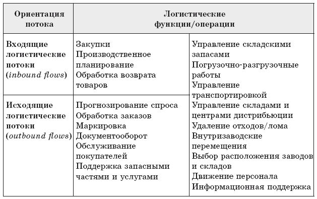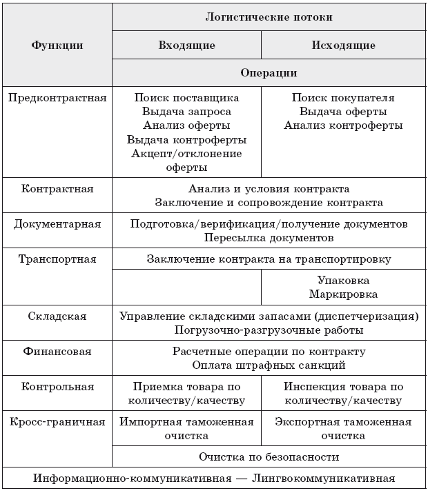 В конечном итоге обособление логистических функций напрямую связано с образованием в компании структурных подразделений службы логистики, отвечающих (как правило, в соответствии с обособленными функциями) за управление закупками, складскими запасами, транспортировкой, упаковкой и консолидацией, погрузочно-разгрузочными работами, коммуникациями и т. п. Специфика международной логистики, разумеется, налагает свой отпечаток на обособление логистических функций/операций. Таким образом, принимая в расчет сказанное, можно сформулировать следующее определение.