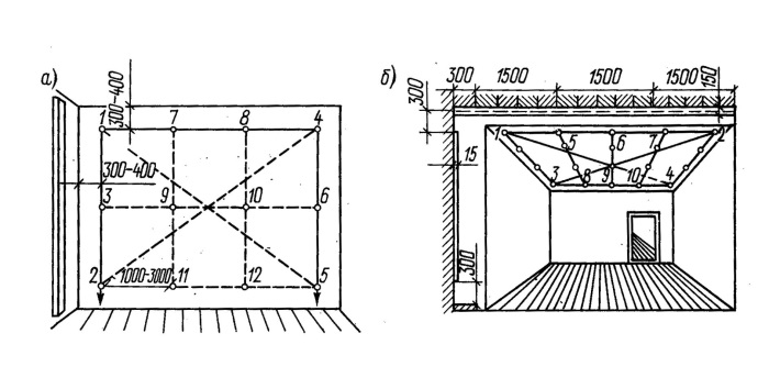 Рис. 2.3. Последовательность провешивания поверхностей а – вертикальных стен; б – потолков; 1–12 – последовательность устройства маяков (гвозди)