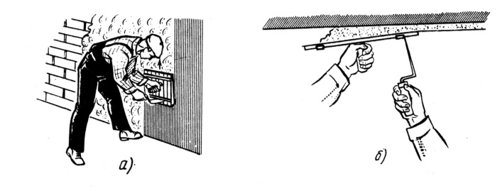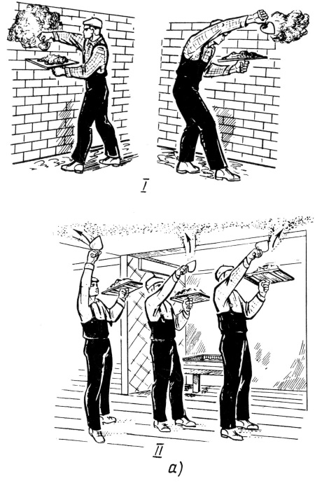 Оштукатуривая стены, раствор набрасывают на уровне головы или несколько выше; на уровне пояса и у пола или подмостей.