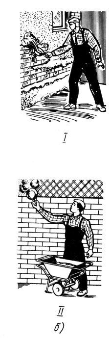 Ковшом раствор наносят на вертикальные и горизонтальные поверхности, а также на карнизы, наличники, откосы и другие части зданий. Ковшом удобнее наносить известковые, известково-цементные и цементные растворы.