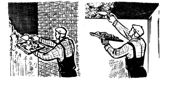 Оштукатуривая стену, сокол держат слегка наклонно к ней. Это удобно для работы и предохраняет руку от попадания на нее раствора.