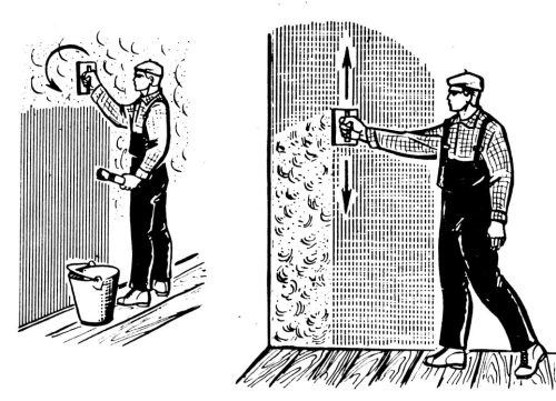 При затирке вкруговую одной рукой берут терку, прижимают полотно к поверхности штукатурки и делают круговые движения против часовой стрелки. Раствор, перемещаемый теркой по поверхности, заполняет отдельные впадины и растирает накрывку. Нажимать на терку следует с различной силой: там, где поверхность имеет выпуклость, – сильнее, где вогнутость – слабее.