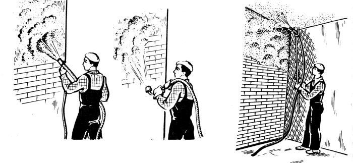 За час до нанесения раствора оштукатуриваемую поверхность смачивают водой с помощью краскопульта или кисти, чтобы вода лучше впиталась в поверхность. Оштукатуривание начинают с нанесения слоя обрызга на потолки и стены в одном помещении, затем переходят в другое, третье и т. д. Если раствор схватывается, грунт можно наносить через 4–5 ч, через такое же время – накрывку.