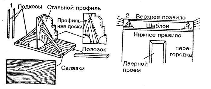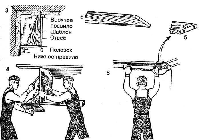 1 – изготовление шаблона и его деталей; 2 – навешивание правил; 3 – положение шаблона в правилах; 4 – вытягивание карниза; 5 – линейка для разделки углов; 6 – разделка углов