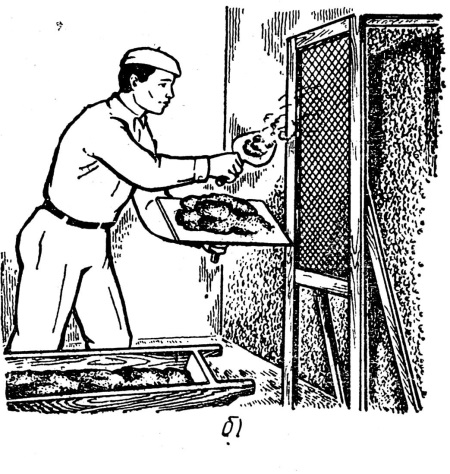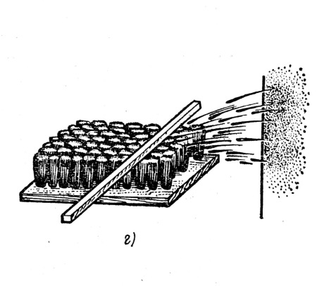 Набрызг со щетки (рис. 2.10, г). Щетку с длинным (6–7 см) и жестким волосом погружают на 1 см в жидкий раствор (осадка стандартного конуса 10–12 см). Излишек раствора стряхивают, подносят щетку к стене и, проводя по волосу щетки линейкой, сбрасывают раствор брызгами на поверхность, повторяя набрызг до полного покрытия всей поверхности.