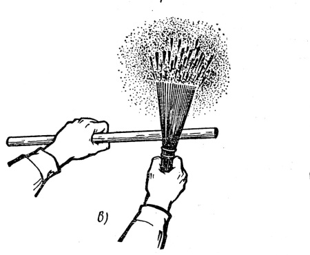 Набрызг с веника (рис. 2.10, в). Раствор стряхивают на поверхность резким взмахом веника или же ударом веника о толстую рейку Чем гуще раствор и больше толщина прутьев веника, тем крупнее набрызг. Толщина прутьев должна быть одинаковой. Толщина слоя 9–12 мм.