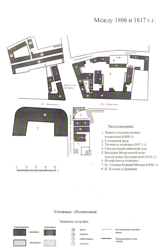 До создания Ильинской площади Ильинский крестец выглядел так, как показано на рис. 1.10. Под номером 7 показана церковь Рождества Богородицы, подлежащая сносу, в группе зданий под номером 1 церковь Дмитрия Солунского, территория которого тоже отводилась под новую площадь и также подлежащую сносу. В течение 1776—1782 гг. часть подворий монастырей: на восточном углу – Иосифовского, на западном – Троицкого отошли под Ильинскую площадь. При этом были снесены церковь и некоторые другие здания обоих подворий, а также церковь Дмитрия Солунского.