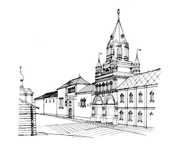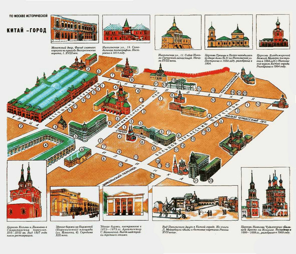 На рисунке 1.6. показана панорама архитектурных памятников Китай-города, подготовленная журналом «Наука и жизнь» [25]. Отдельно, вверху и внизу даны рисунки наиболее уникальных зданий. Поскольку надписи под ними плохо просматриваются, перечислим их. Вверху слева направо:
