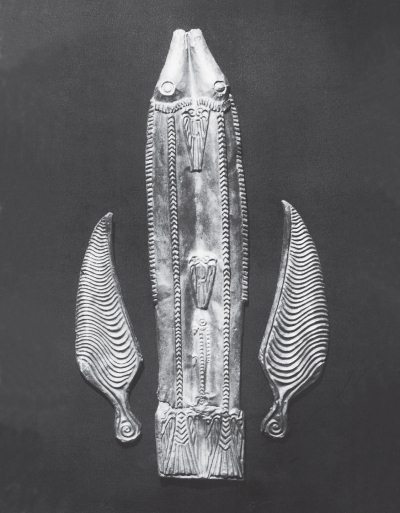Илл. 15. Золотой налобник в виде рыбы и два нащечника в виде крыльев.