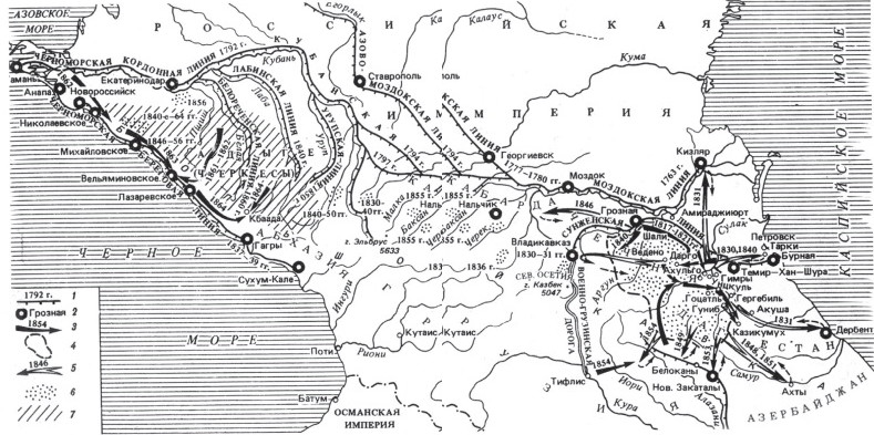 1 – Кавказские укреплённые линии и даты их основания. 2 – Крепости и укреплённые пункты. 3 – Основные направления действий царских войск. 4 – Территории Имамата в 40-х годах. 5 – Основные направления действий Гази-Магомеда и Шамиля. 6–7 – Народно-освободительные движения.