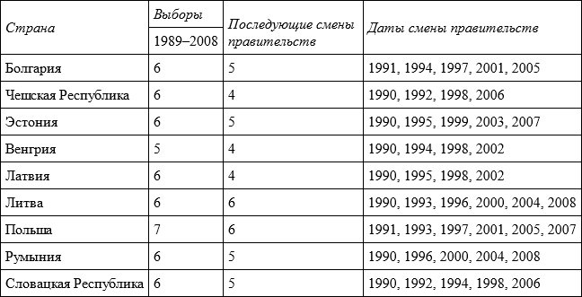 В таблице 1 представлены десять стран Восточной Европы – новых членов ЕС. Во всех этих странах руководство неоднократно менялось в результате выборов, и это свидетельствует о том, что они стали демократиями. Применяя венгерский политический жаргон можно сказать, что ни в одной из них никакая политическая сила не способна перманентно «зацементировать себя во власти». Иными словами, ни одна правительственная партия или партийная коалиция не способны лишить шансов соперничающие оппозиционные партии в долгосрочной перспективе.