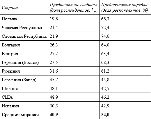 Примечание: Время обследования 1997–1998 гг. Вопрос, задаваемый респондентам: «Если бы вам пришлось делать выбор, что бы вы назвали самой важной обязанностью правительства: 1. Поддержание порядка в обществе; или: 2. Уважение свободы личности».