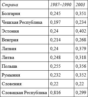 После смены системы положение с неравенством доходов изменилось очень быстро и решительно. Посмотрим, прежде всего, на новых членов ЕС, представленных в табл. 4.