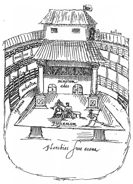 Этот драгоценный при всей своей примитивности рисунок (находится в библиотеке Лейденского университета) принадлежит голландцу Иоанну Девиту, посетившему Лондон в 1596 г. Он ярко выясняет главную особенность театра того времени: сцена находится посреди театра, поэтому немыслимы декорации. Актеры появляются из дверей задней части сцены. Над сценой возвышается балкон, откуда часто говорят действующие лица шекспировских пьес. Зрители помещается частью в ложах (sedilia), а большей частью вокруг сцены.