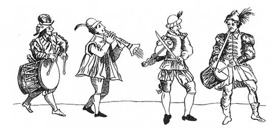 Музыканты, участвующие в спектакле. Гравюра, 1588 г.