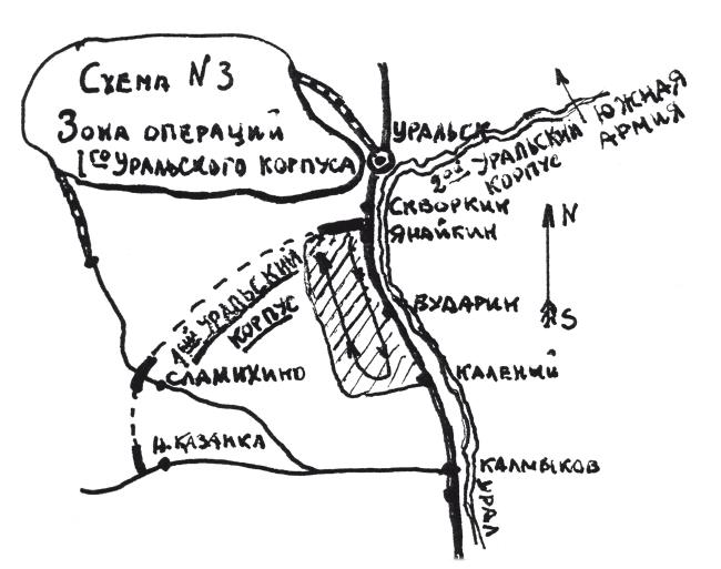 1-й Уральский корпус, удерживая сектор фронта к западу от реки Урал, к описываемому моменту главными своими силами занимал район к западу от станицы Янайкинской и саму Янайкинскую. Здесь была сосредоточена вся пехота корпуса: помимо уже упомянутого 1-го Уральского пехотного полка, Николаевский, Семёновский и Царевский партизанские отряды, Татарская рота, общей численности около 3 ]/г тысяч. Конниц: 1 – я дивизия полковника Кирилова, 2-я дивизия полковника Сладкова, 6-я дивизия полковника Бородина и, наконец, 3-я Илецкая дивизия, временно приданная корпусу полковника Щедрина[30]; 6-я дивизия полковника Бородина была расположена в районе Сламихинская – Новая Казинка, 200 вёрст к юго-западу от Янайкинской, имея задачей обеспечение направления со стороны Александровского Гая на Калмыков, направления, грозившего нашему главному пути сообщением с Гурьевым. Общая численность конницы – 8 16-9 тысяч. Броневой отряд в составе двух машин находился в Бударине, авиационный в Гурьеве.
