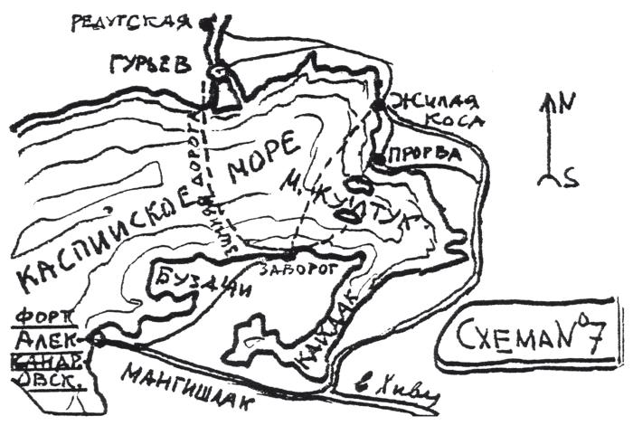 Накануне прибытия отряда в Прорву небольшая группа опытных разведчиков была выслана в направлении на Заворот для исследования степени проходимости морского пути. По возвращении разведчики сообщили: лёд в прибрежной 20-вёрстной зоне достаточно прочен, чтобы выдерживать вес лошади и саней; открытое море свободно от льда. Кратко и ясно. Недопустимость моря для нас стала очевидной. Новая западня. Единственным выходом из неё оставался путь гибели через закаспийские степи, плоскогорье Усть-Урта и Мангишлакский полуостров, путь шестисотвёрстного протяжения. Этот неизвестный путь, доступный только весной и осенью, и только для верблюжьих караванов, в настоящую пору года являл собою, конечно, трудности, выходящие за пределы нашего воображения.