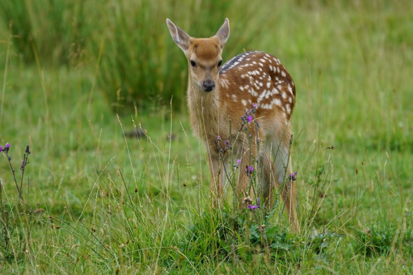 Решив, что разгадку все же надо искать снаружи, я вышел из палатки и увидел рядом с собой очень необычное сказочное существо. Это была молодая дикая лань высотой всего около полуметра с очень необычной расцветкой своего тела. По всему ее туловищу, покрытому искрящимся на солнце светло коричневым ворсом, располагалось множество небольших белых пятнышек, отдаленно напоминающих собой красочное убранство гриба мухомора.