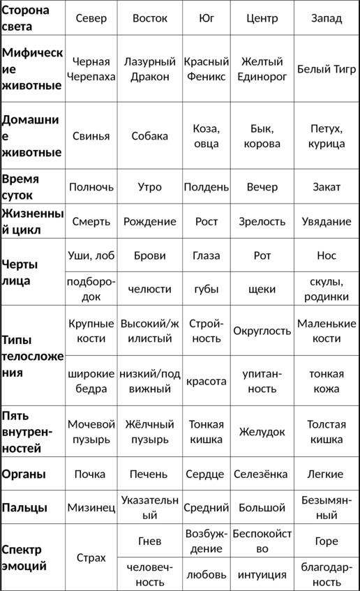 Подобным образом печень и желчный пузырь соответствует дереву, сердце и тонкий кишечник – огню, селезенка и желудок – земле, легкие и толстый кишечник – металлу, почки и мочевой пузырь – воде. Связь между печенью и деревом объясняется следующим образом. Дерево обладает свойствами роста и становления, а печень выполняет в организме функции перемещения и выделения. По этой причине печень причисляется к «дереву». Сердце, орган типа инь с характером ян, выполняет функцию нагрева. Специфическим свойством огня является жар, соответствующий ян. Поэтому сердце причисляется к «огню». Селезенка определяется как «начало возникновения и превращения». Земля также характеризуется в китайской философии как производитель и преобразователь всех вещей. По этой причине селезенка причисляется к «земле». Легкие обладают функцией расширения и очищающего выведения наружу. К числу специфических характеристик металла также относятся ясность и чистота; в соответствии с китайскими представлениями металл обладает функцией растворения и расширения. Под этим углом зрения легкие относятся к «металлу». Почки имеют согласно представлениям китайской медицины двоякую задачу: регуляцию водного обмена и накопление семени или жизненной субстанции (Чин, Цзин), Вода поддерживает выделения во влажном и обеспечивающем их проходимость состоянии», поэтому почки причисляются к «воде».