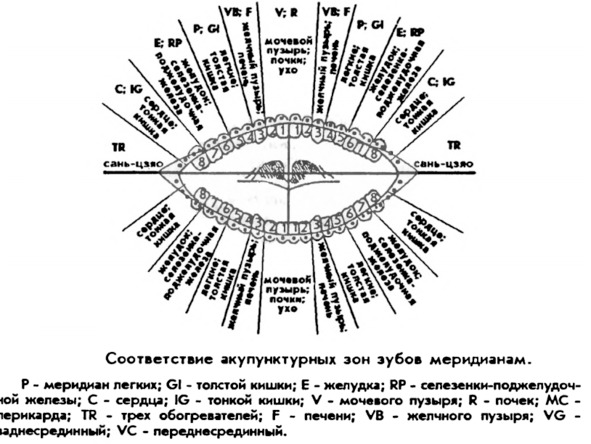 Сухие, увядшие, подвижные, цвета кости зубы указывают на наличие энергий холода, пустоты, инь; разрушенные – на энергии жара, полноты, избытка в соответствующем канале (органе).