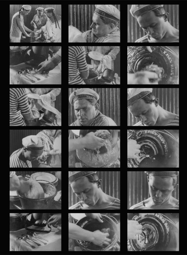 Секвенция с офицерской тарелкой выглядит как сконцентрированная во времени и пространстве формула этого стилистического принципа: действие разложено на фазы и элементы, снято на кинопленку с разных точек и монтажно воссоздано на экране.