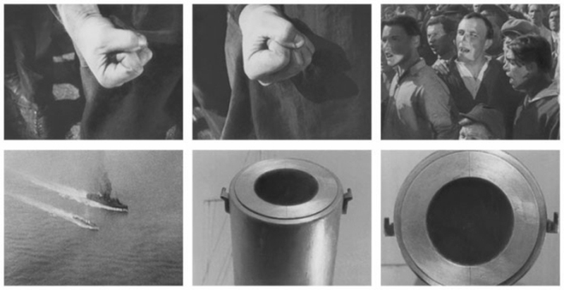 У самого Эйзенштейна прямым предварением такого построения был эпизод из «Стачки»: разгон демонстрации бастующих водой. В нем кадры пожарных с брандспойтами и руководящего ими агента полиции сталкиваются с общими и крупными планами разгоняемых рабочих, перебиваясь кадрами водяных струй – то их общими планами на фоне домов и людей, то укрупнениями потоков до почти абстрактных диагоналей и вертикалей.