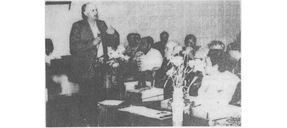 В. И. Коско выступает перед бывшими партизанами и подпольщиками в музее отряда Градова-Ваупшасова в ГПТУ №23.