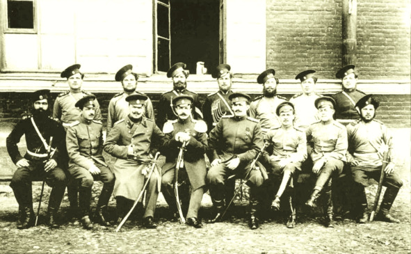 Казаки Лейб гвардии Казачьего полка. Сидит четвёртый слева – полковник Хрещатицкий. Офицер с солдатским Георгием – сотник Васильковский. Крайний справа сидит казак х. Средне Митякинского Исаев В. Фото из семейного архива автора.