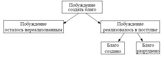 На схеме 3 субъект имел умысел (прямой или косвенный) разрушить благо, и благо было разрушено. Здесь также имеется совпадение мотива и результата. Однако случается, что субъект имел побуждение, направленное на разрушение того, что является благом, но замысел не осуществил: может быть, потому, что не решился, а может быть потому, что злое побуждение было вытеснено добрым [286]. Случай, если злое побуждение было вытеснено добрым, свидетельствует, на наш взгляд, о том, что побуждение стало другим, и это будет соответствовать схеме 2.