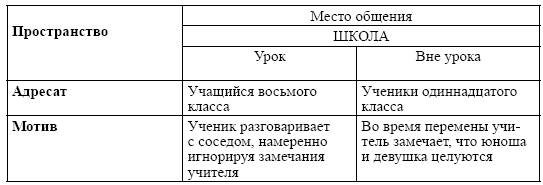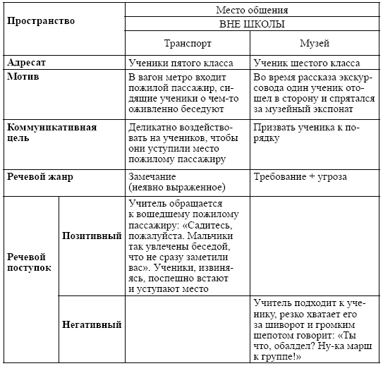 Представим «путь» речевого жанра к РП учителя. Выбор говорящим/пишущим того или иного речевого жанра обусловлен местом, условиями общения, его участниками, мотивом и целью. В основе приведенных в таблицах примерах лежат наиболее типичные ситуации педагогического общения: урок, внеклассные и внешкольные мероприятия, общение педагога с учащимися в культурно-просветительских учреждениях (музеи, театры, выставки и т. и.), а также в транспорте. Проиллюстрируем на конкретных ситуациях общения речевые поступки учителя (см. табл. 4, 5[29]).